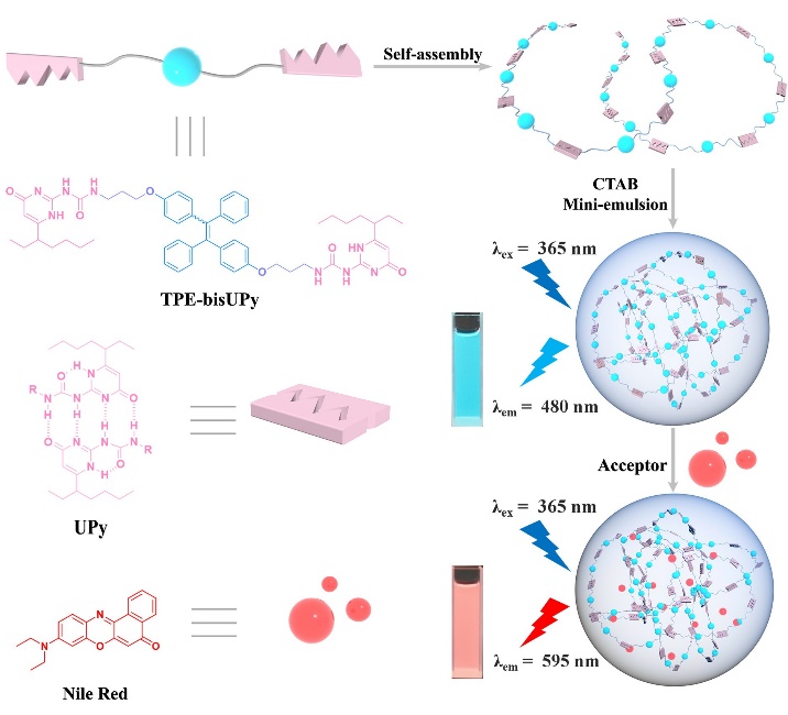 近日,我院孫小強/王樂勇聯(lián)合團隊青年教師肖唐鑫博士在Chemical Communications上發(fā)表研究論文(DOI: 10.1039/D0CC05077F)。光合作用是自然界的普遍現(xiàn)象,是一切生命的基礎。模擬光合作用的光能捕獲和能量轉(zhuǎn)移過程具有重大意義。本論文利用TPE基團橋連的雙UPy化合物作為天線分子和給體,通過四重氫鍵形成超分子聚合物,并進一步在水溶液中通過微乳化組裝成超分子納米顆粒,并負載NiR染料作為能量受體,構(gòu)筑了一個基于水相的超分子光捕獲體系,并展現(xiàn)出高效的能量轉(zhuǎn)移效率和天線效應以及顏色可調(diào)的發(fā)光功能。