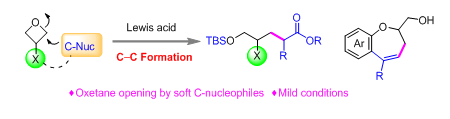 我校石油化工學(xué)院黃海、孫建偉團隊一直致力于氧雜環(huán)丁烷的功能性轉(zhuǎn)化研究,通過利用氧雜環(huán)丁烷特殊親電性,從而實現(xiàn)一系列具有較高價值的有機分子骨架。近日,黃海、孫建偉團隊通過利用烯醇硅醚作為軟碳親核試劑,成功地實現(xiàn)了氧雜環(huán)丁烷的碳開環(huán)反應(yīng)。此項工作避開了傳統(tǒng)的金屬試劑,在軟碳親核試劑方面取得了完全新穎的突破,反應(yīng)所構(gòu)建的產(chǎn)物4-羥基酯更是一類在全合成領(lǐng)域具有巨大應(yīng)用的分子骨架。通過巧妙的分子設(shè)計,同樣的策略成功地應(yīng)用到了分子內(nèi)碳開環(huán)反應(yīng)中,為天然產(chǎn)物骨架benzo[b]oxepine提供了全新的構(gòu)建策略。這項研究不僅是兩個著名的有機人名反應(yīng)Mukaiyama Aldol和Prins Reaction的延伸,也為氧雜環(huán)丁烷開環(huán)反應(yīng)提供了新的思路。