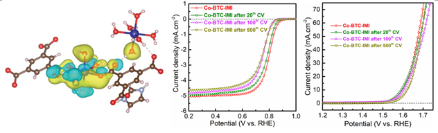 純相金屬有機(jī)骨架(MOFs)在催化領(lǐng)域具有巨大的應(yīng)用潛力,但是由于這類材料的導(dǎo)電性不夠高,在能源轉(zhuǎn)換和存儲(chǔ)電催化領(lǐng)域中應(yīng)用受到的限制。銀鳳翔、陳標(biāo)華課題組理論計(jì)算研究發(fā)現(xiàn),MOFs中的不飽和配位能降低空間位阻,促進(jìn)活性中心與水分子和氧氣分子的相互作用,降低電子傳導(dǎo)阻力,提高材料的導(dǎo)電性,使得這種MOFs在電催化中具有增強(qiáng)的質(zhì)量傳遞和電子傳遞特性。根據(jù)這一發(fā)現(xiàn),課題組采用鈷離子、均苯三甲酸和咪唑通過水熱反應(yīng)合成了金屬有機(jī)骨架Co-BTC-IMI,該材料中的一個(gè)Co離子分別被兩個(gè)去質(zhì)子化的均苯三甲酸連接,構(gòu)建了Co金屬中心的不飽和配位。該金屬有機(jī)骨架在堿性半電池中可提供0.80 V(參比可逆氫電極)的氧氣還原反應(yīng)半波電勢(shì),并在10 mA·cm-2電流密度下提供了1.59 V(參比可逆氫電極)的氧氣析出反應(yīng)電勢(shì)。該工作在將純相MOFs直接應(yīng)用于氧氣電催化領(lǐng)域中取得了突破性進(jìn)展,為能源轉(zhuǎn)換和存儲(chǔ)科學(xué)和技術(shù)的發(fā)展提供了新的思路。近日,該成果已經(jīng)發(fā)表于國際頂級(jí)期刊Journal of Materials Chemistry A上。此項(xiàng)工作得到了江蘇省綠色催化重點(diǎn)實(shí)驗(yàn)室、江蘇省自然科學(xué)基金以及國家自然科學(xué)基金的資助。