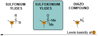 锍葉立德作為兩性離子化合物,一般需要在葉立德Cα-位引入吸電子基來穩(wěn)定其存在。此外,根據(jù)硫原子氧化態(tài)的不同,可以分為sulfonium ylide(正锍葉立德)與sulfoxonium ylide(氧化锍葉立德)兩大類。電負性氧原子的引入,不僅使得氧化锍葉立德的葉立德碳Lewis堿性降低,而且具Lewis堿性的氧原子或副產(chǎn)物DMSO容易與手性催化劑結(jié)合,從而可能對反應(yīng)過程中的手性誘導產(chǎn)生干擾。但與正锍葉立德以及類似的重氮化合物相比,氧化锍葉立德具有良好的穩(wěn)定性,之前報道的絕大多數(shù)文獻都將其作為重氮化合物的替代物經(jīng)金屬卡賓中間體應(yīng)用于有機合成。因此,發(fā)展基于锍葉立德不對稱催化研究具有重要意義。