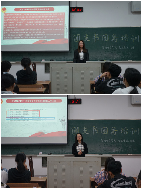 院團(tuán)委書(shū)記孫潘老師從思想建設(shè)方面講述了共青團(tuán)工作的重要性,指出各團(tuán)支部應(yīng)從信仰公開(kāi)課入手加強(qiáng)團(tuán)員思想教育,做好團(tuán)員發(fā)展與后續(xù)教育工作,加強(qiáng)團(tuán)支部建設(shè),提升團(tuán)支部凝聚力。副書(shū)記許涵僑同學(xué)對(duì)“雙述雙評(píng)”、“團(tuán)日活動(dòng)”、“黨史學(xué)習(xí)會(huì)”的開(kāi)展進(jìn)行了具體培訓(xùn),并對(duì)下半年推優(yōu)工作進(jìn)行了具體布置。