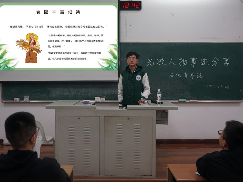 分享會(huì)上,許涵僑簡(jiǎn)要介紹“石化青年說(shuō)”的基本內(nèi)涵后,主講人湯越詳細(xì)地講述袁隆平同志的生平和貢獻(xiàn),著重分享袁隆平先生的精彩言論集,并以此呼吁廣大青年傳承袁隆平先生的偉人精神。