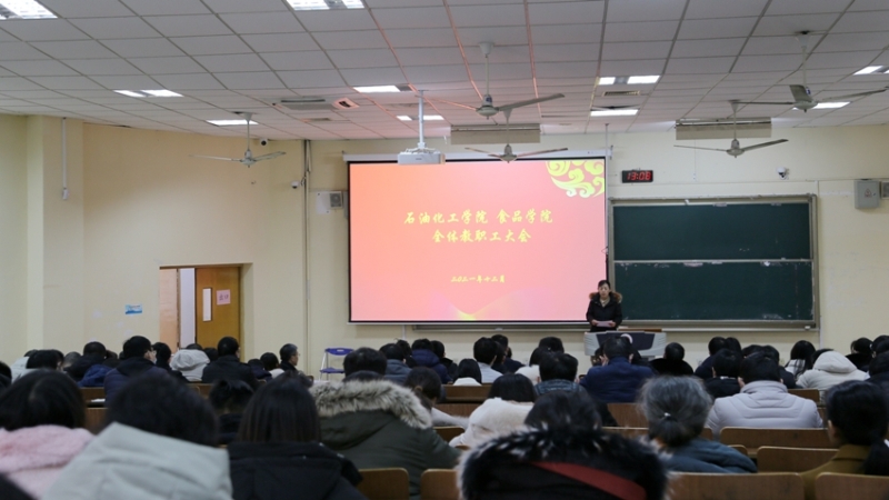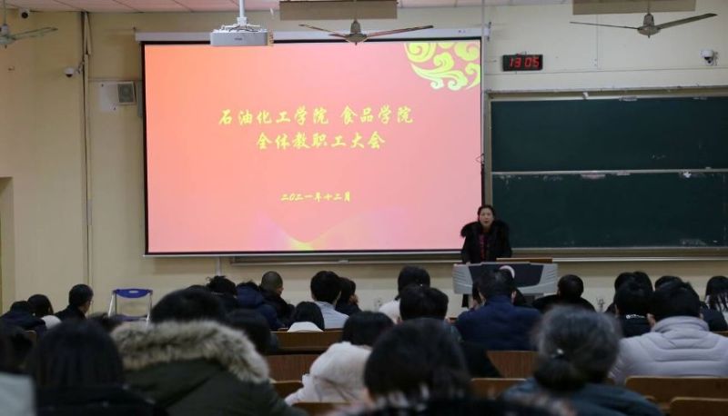 2021年12月30日,石油化工學院 食品學院分工會召開全院教職工大會。會議總結了學院2021年的整體工作,著重就學期末、假期中、開學初的重點工作做了部署。正值2021歲末,學院領導為全院職工帶來祝福,祝愿新的一年大家共同努力、共同進步!