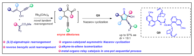 我們發(fā)展了一種金屬-有機(jī)接力催化策略即:金屬銠催化重氮和烯炔醇經(jīng)過串聯(lián)重排反應(yīng)得到烯炔二酮(enyne diketones), 烯炔二酮作為新穎的Nazarov反應(yīng)底物在手性催化劑的催化下,高對(duì)映和非對(duì)映選擇性制備一系列手性聯(lián)烯環(huán)戊烯酮。
