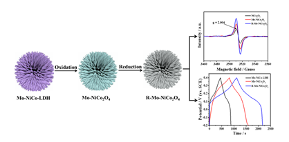 近年來,過渡金屬氧化物以其可變的氧化價態(tài),成本低廉,易于制備而引起廣泛關(guān)注。此外,鑒于過渡金屬氧化物的理論比電容較高且電活性較好,故而在儲能領(lǐng)域具有重要地位。在本工作中,課題組提出了一種雙缺陷工藝構(gòu)建富含氧空位和Mo摻雜的NiCo2O4(R-Mo-NiCo2O4)。通過NaBH4還原在NiCo2O4晶格中產(chǎn)生氧空位缺陷,在材料中產(chǎn)生更多的載流子,使更多活性物質(zhì)參與電化學(xué)氧化還原反應(yīng)過程。此外,氧空位和Mo摻雜的協(xié)同作用不僅提高了材料的導(dǎo)電性,而且豐富了氧化還原動力學(xué)。將通過氧空位和Mo摻雜雙缺陷工藝制備得到的R-Mo-NiCo2O4用做超級電容器電極,在電流密度1 A g?1下比容量高達285.8 mAh g?1,且具有較好的倍率性能及循環(huán)穩(wěn)定性。該電極材料優(yōu)異的性能可歸因于R-Mo-NiCo2O4較大的比表面積可增加其與電解質(zhì)的接觸面積,實現(xiàn)電解質(zhì)充分擴散的同時縮短了電荷轉(zhuǎn)移的擴散路徑;Mo元素的引入促進了電荷轉(zhuǎn)移,提高了R-Mo-NiCo2O4的導(dǎo)電性,同時Mo元素的引入有助于形成氧空位缺陷,促進離子在電極中的擴散;經(jīng)NaBH4還原后,氧空位缺陷的數(shù)量可進一步增加,提升了該電極材料的電化學(xué)性能。該成果于近日發(fā)表于化學(xué)領(lǐng)域著名期刊Chemical Communications (2022, 58, 5120–5123)。
