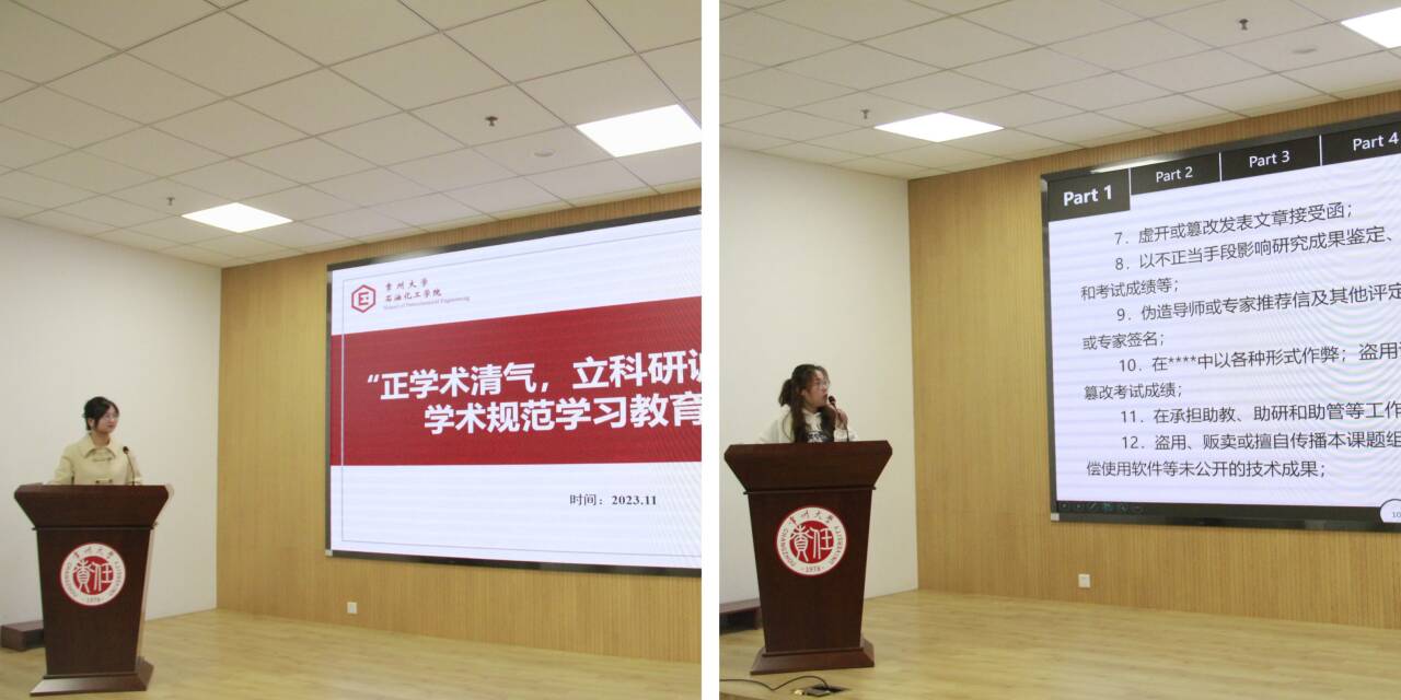 為引導研究生自覺遵守科學研究規(guī)律,強化學術(shù)規(guī)范意識,近日,我院在測試樓B109報告廳舉辦以“正學術(shù)清氣,立科研誠信”為主題的研究生學術(shù)規(guī)范學習教育宣講會。本次宣講會由仲之陽和張纖纖同學主講,各年級班長、團支書及研究生第三黨支部全體黨員參加學習。