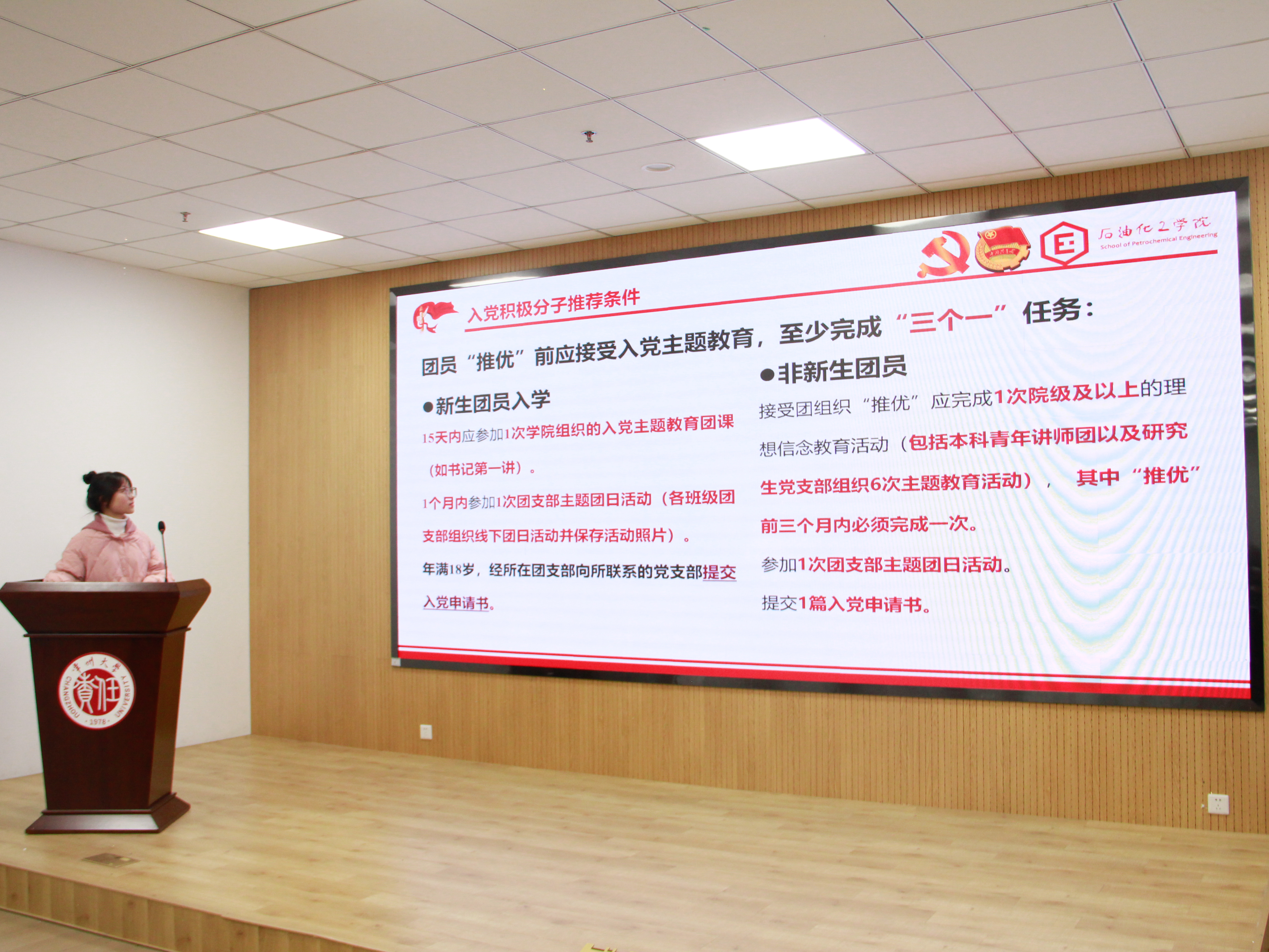 首先,余琳琳概述了常州大學(xué)共青團(tuán)推優(yōu)入黨工作實(shí)施辦法,并詳細(xì)介紹了入黨積極分子和發(fā)展對(duì)象的推薦條件及推優(yōu)工作程序。隨后,晏春風(fēng)根據(jù)《常州大學(xué)發(fā)展黨員工作實(shí)施細(xì)則》向同學(xué)們介紹了黨員發(fā)展流程和入黨材料填寫要求。最后,趙彩霞對(duì)黨員發(fā)展的時(shí)間線做進(jìn)一步梳理和總結(jié),鼓勵(lì)團(tuán)員們向身邊的黨員看齊,積極發(fā)揮先鋒模范作用。勤奮科研,提高創(chuàng)新能力,力爭(zhēng)將所學(xué)所專與國(guó)家需求相結(jié)合;甘于奉獻(xiàn),增強(qiáng)服務(wù)意識(shí),主動(dòng)為周邊老師同學(xué)等提供幫助支持,以實(shí)際行動(dòng)向黨組織靠攏。