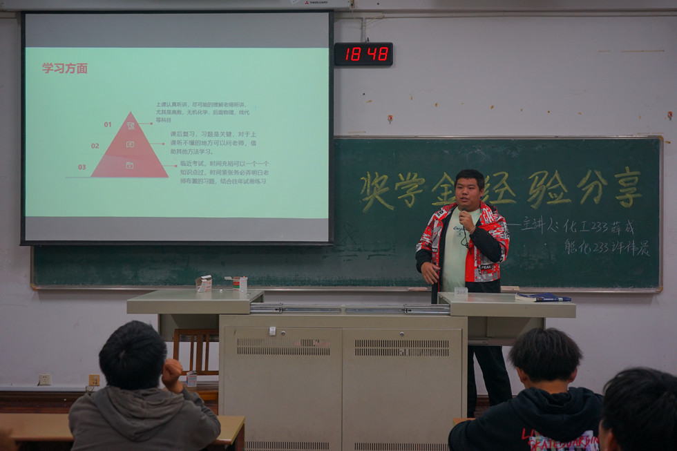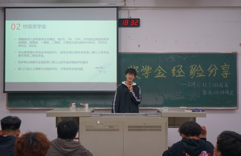 為全面宣傳普及高校獎(jiǎng)學(xué)金政策,鼓勵(lì)學(xué)生力求上進(jìn),勇爭上游,加強(qiáng)學(xué)院學(xué)風(fēng)建設(shè),我院于10月22日在W1206教室開展“石化青年說”系列講座第一講——獎(jiǎng)學(xué)金經(jīng)驗(yàn)分享。本次講座由化工233薛成和能化233許偉晨主講,學(xué)生代表參加。