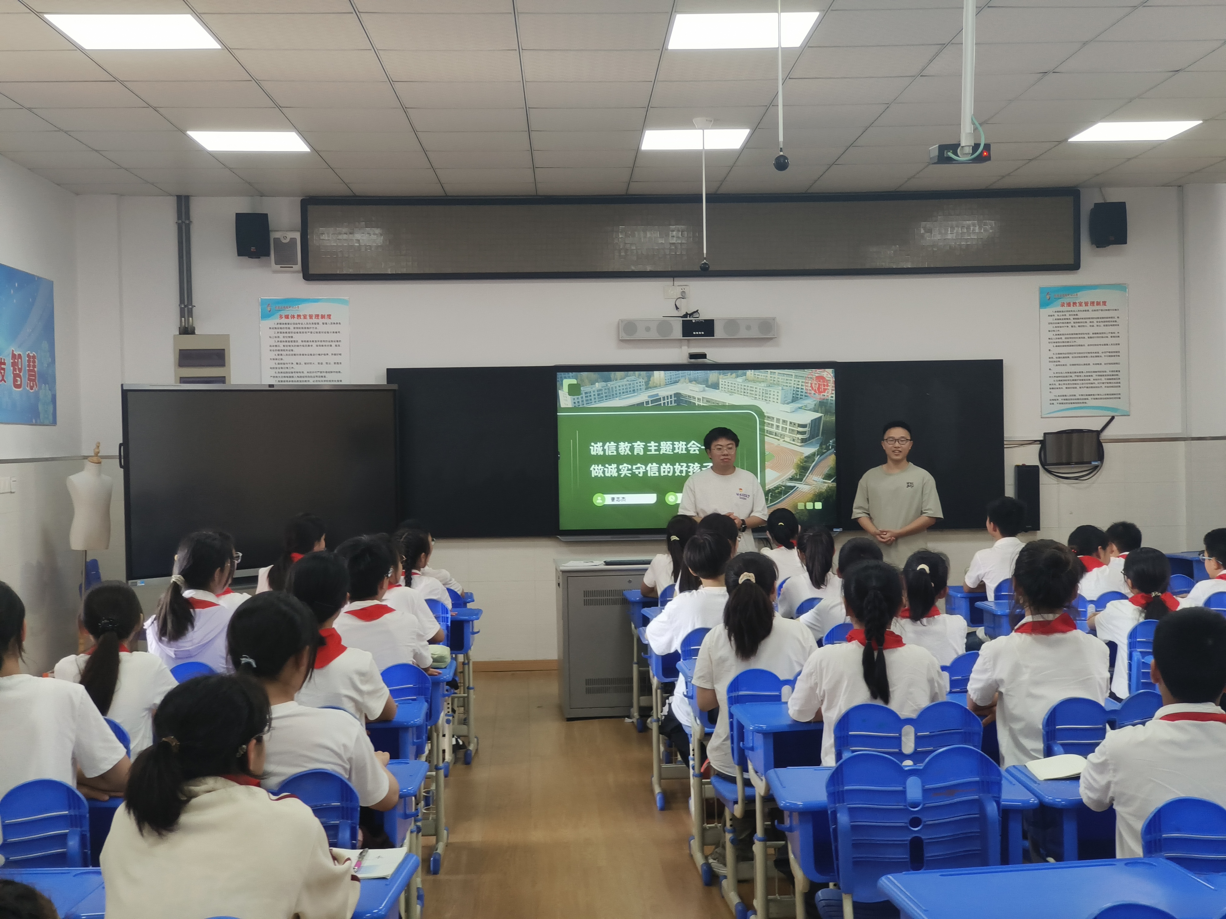 活動以“季布一諾千金”的歷史典故開篇,曹志杰用通俗易懂的語言講述了季布因誠信贏得信任、化解危機的故事,引導孩子們思考“誠信是什么”。張皓博則結合學生日常學習與生活場景,列舉了考試不作弊、作業(yè)獨立完成、守時守信等具體事例,強調誠信需從點滴做起?;顒幼詈笕w學生齊聲宣讀誠信承諾書,立志成為誠實守信的新時代好少年。