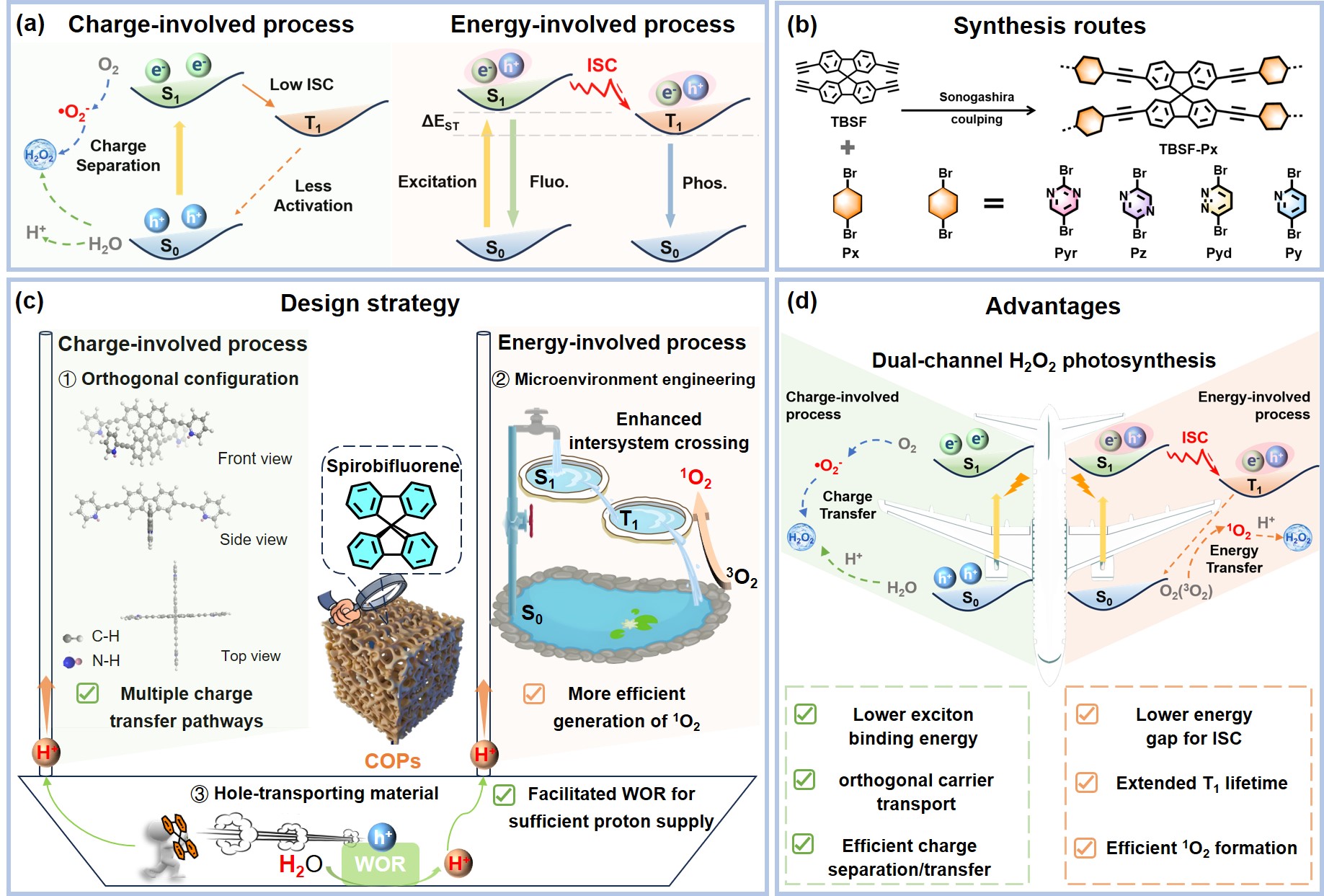 (2)針對質子供應有限的問題,我們在之前的工作中(Chem, Sci.2025, 16, 8577-8587)提出“質子海綿”的概念,直接給氧還原反應(ORR)供質子,來解決“質子悖論”問題。但該策略并未有效抑制光生載流子的復合和提高電荷傳輸能力。為此,我們提出直接提高水氧化反應(WOR)性能的策略,以螺二芴分子為構筑單元合成COPs催化劑(圖2)。螺二芴具有正交的空間構型,是高效的空穴傳輸材料,基于其的COPs具有諸多優(yōu)點,例如WOR性能大幅度提高以產生更多質子,滿足ORR較快的動力學需求;加速空穴消耗,抑制載流子復合;獨特的正交電荷傳輸通道更是加速了電荷的傳輸。因此,這類COPs催化劑在純水和空氣中的產H2O2速率達到9.29 mmol g-1 h-1,在氮氣氛圍中也能達到3.28 mmol g-1 h-1。該工作以Orthogonal Configurative Spirobifluorene-Based Conjugated Organic Polymers for Enhanced Water Oxidation Reaction to Boost H2O2 Photosynthesis為題,發(fā)表在材料學領域頂級期刊Adv. Funct. Mater.2025, e18050。