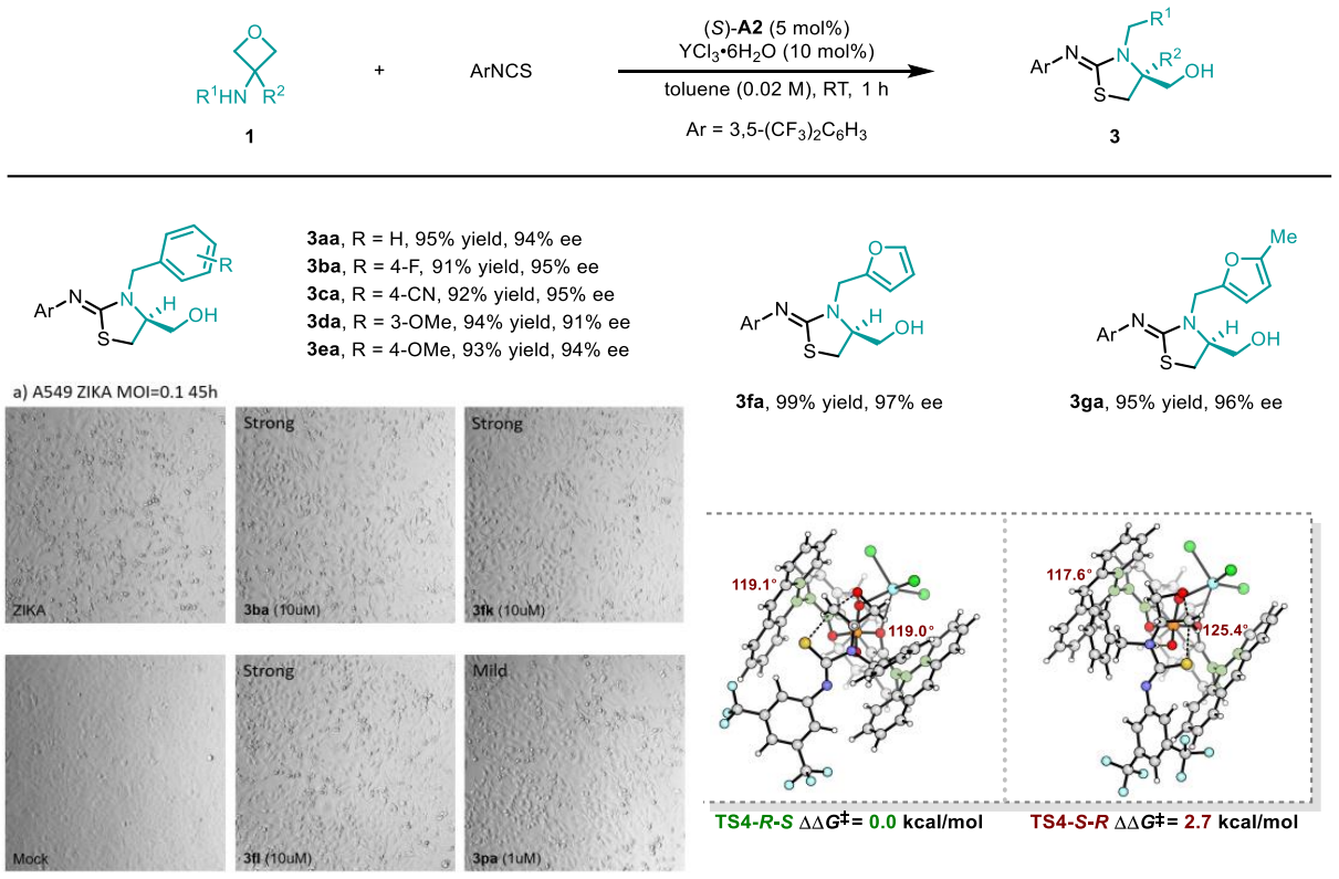 近日,常州大學(xué)孫建偉、黃海、韓政宇等人報(bào)道了一種用于3-氨基氧雜環(huán)丁烷與異硫氰酸酯對(duì)映選擇性環(huán)化構(gòu)建手性2-亞氨基噻唑烷的二元催化體系。該工作采用手性磷酸與路易斯酸組成的二元催化體系,在溫和條件一步構(gòu)建了具有多個(gè)可調(diào)取代基的手性2-亞氨基噻唑烷骨架。作者通過(guò)對(duì)照實(shí)驗(yàn)、中間體捕獲嘗試以及DFT計(jì)算系統(tǒng)闡明了反應(yīng)機(jī)理,揭示手性磷酸負(fù)責(zé)活化氧雜環(huán)丁烷進(jìn)行分子內(nèi)SN2開環(huán),而路易斯酸并不直接活化底物,而是通過(guò)增強(qiáng)手性磷酸的酸性和剛性來(lái)提升其催化性能,其中過(guò)渡態(tài)中N–H···O–P氫鍵的穩(wěn)定作用及催化劑構(gòu)象的不利扭曲是決定對(duì)映選擇性的關(guān)鍵因素。該研究進(jìn)一步發(fā)現(xiàn)所得手性產(chǎn)物對(duì)寨卡病毒(ZIKV)具有顯著抑制活性,在低細(xì)胞毒性下可使病毒RNA水平降低80%以上,凸顯了該類化合物作為新型抗病毒先導(dǎo)結(jié)構(gòu)的巨大潛力,為抗病毒藥物研發(fā)提供了新的化學(xué)空間。