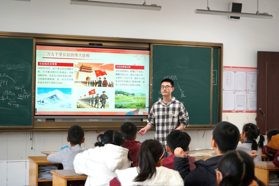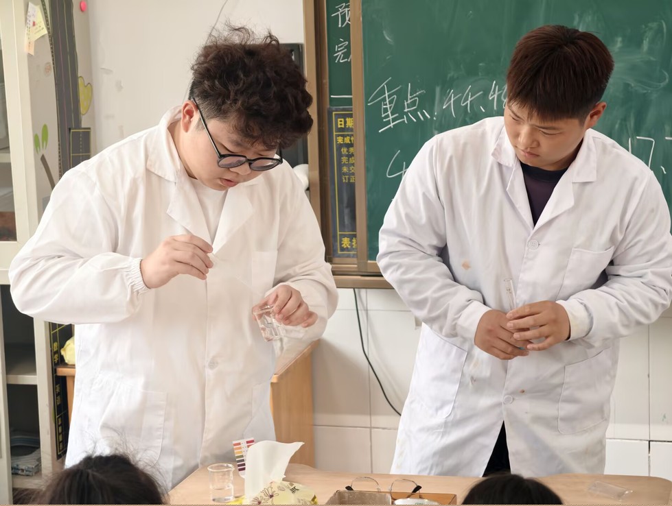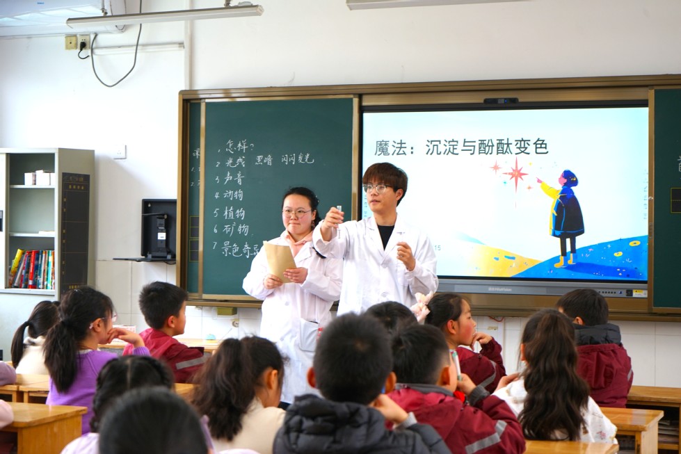 活動現(xiàn)場,志愿者們帶領同學們開展兩項趣味化學實驗,同學們親手操作實驗器材,觀察色彩變化與氣泡現(xiàn)象,在志愿者的講解中理解化學原理。隨后,志愿者們講述了長征故事與“常州三杰”革命事跡,讓同學們感受先輩的堅韌與赤誠,了解本地革命先輩的奉獻事跡。此次活動為我院學子提供了實踐鍛煉的機會,也為附屬小學的同學送去了化學知識與紅色滋養(yǎng)。