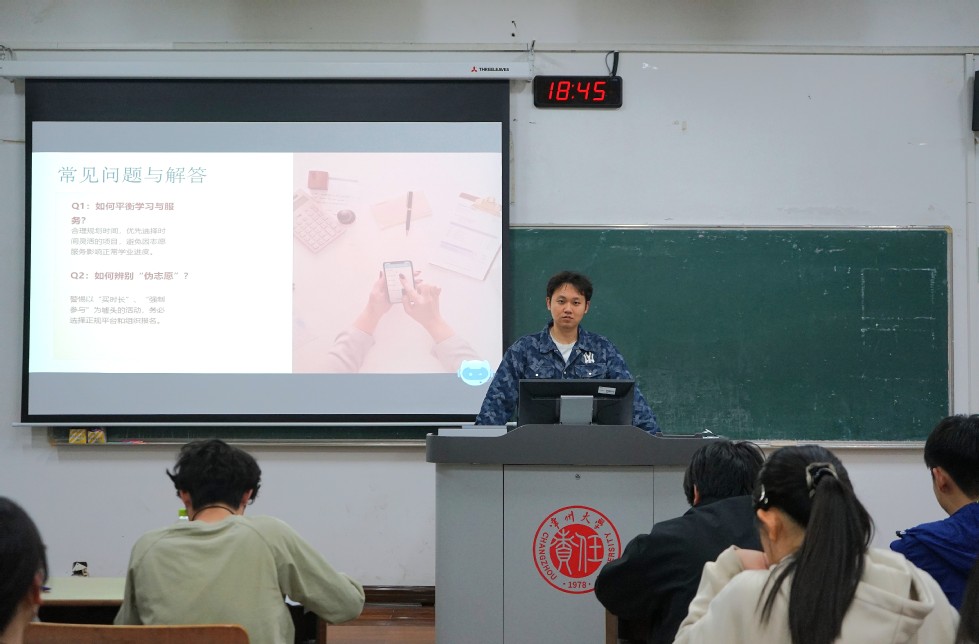 會上,兩位同學(xué)結(jié)合個(gè)人經(jīng)歷,圍繞志愿精神內(nèi)涵、個(gè)人服務(wù)經(jīng)歷、能力提升指南及未來展望展開分享。王梓豪為同學(xué)們分享了幾段個(gè)人志愿服務(wù)經(jīng)歷,鼓勵(lì)同學(xué)們主動參與志愿實(shí)踐,在服務(wù)中迎難而上、收獲成長。宋羽凡則補(bǔ)充選擇項(xiàng)目應(yīng)結(jié)合興趣、專業(yè)與課余時(shí)間,通過正規(guī)渠道參與,平衡好學(xué)業(yè)與服務(wù)。