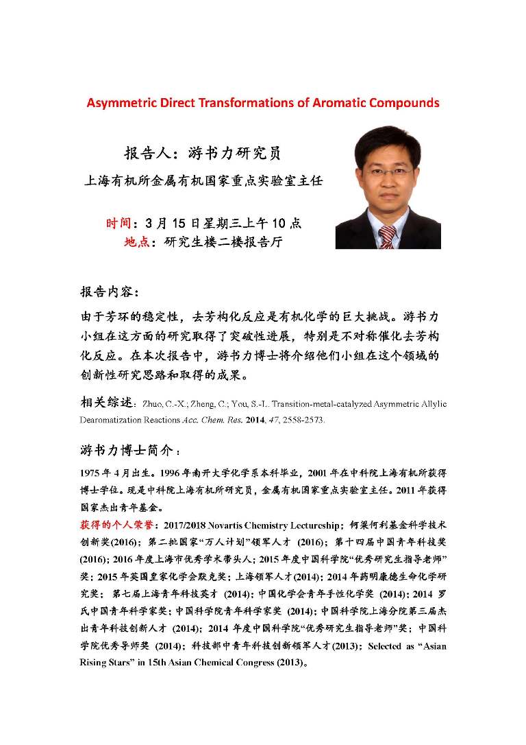 【講座】3月15日學術報告--游書力研究員(上海有機所)