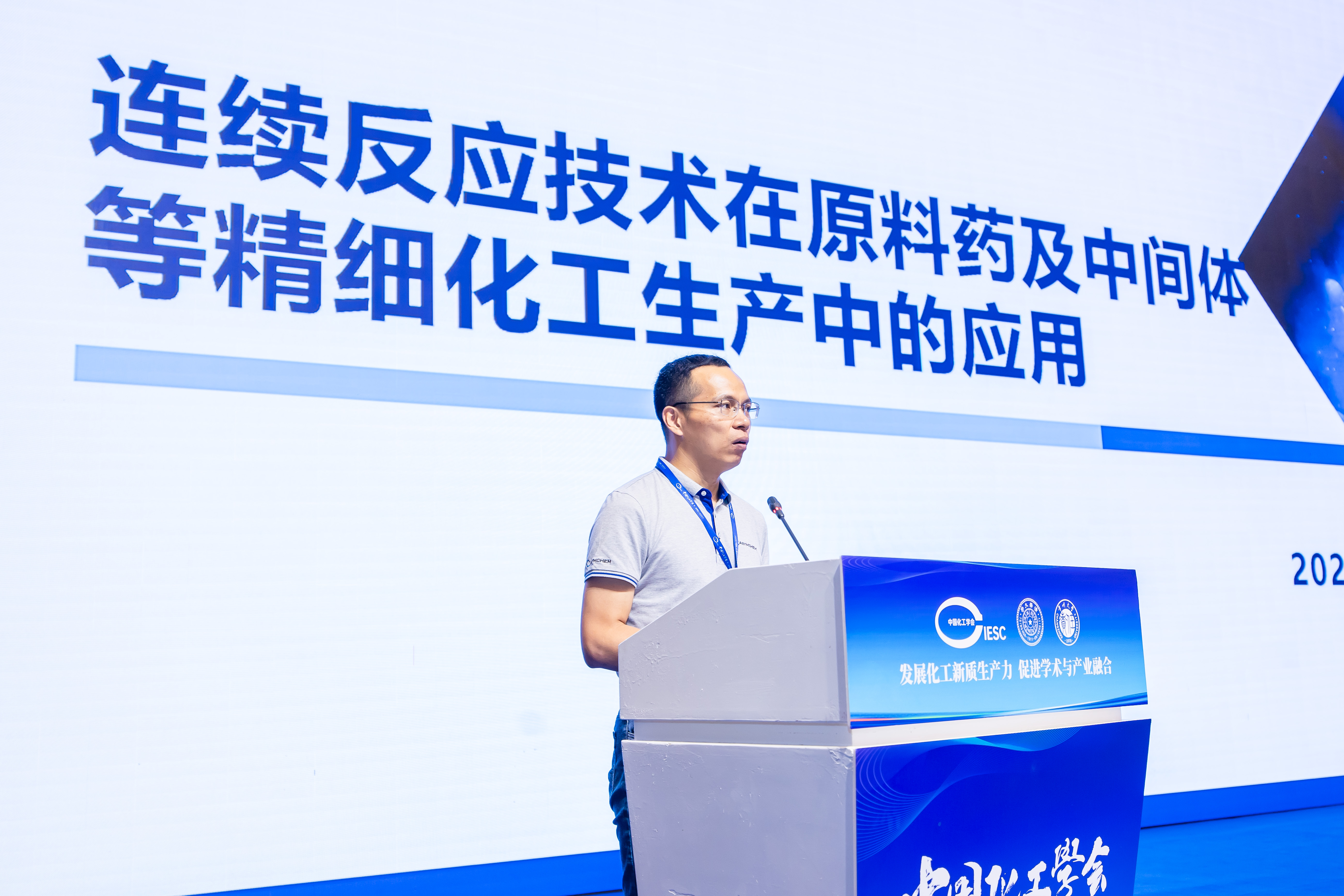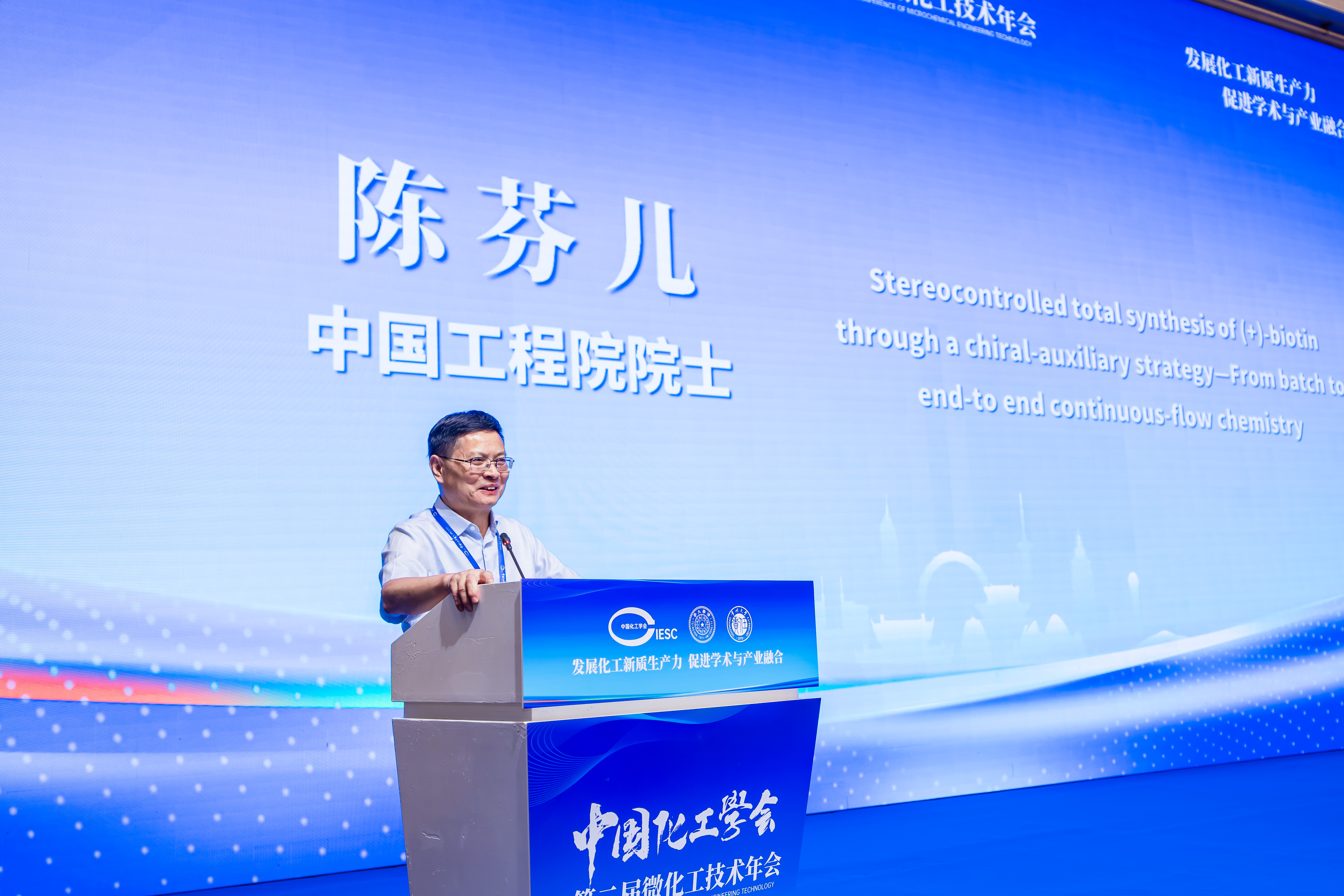 陳海群致辭 學(xué)術(shù)特邀報告會環(huán)節(jié),陳芬兒作《Stereocontrolled total synthesis of (+)-biotin through a chiral-auxiliary strategy—From batch to end-to end continuous-flow chemistry》大會報告,彭孝軍作《先進(jìn)光刻材料進(jìn)展》大會報告,任其龍作《重要工業(yè)氣體制造過程強(qiáng)化技術(shù)探索》大會報告,蔣軍成作《微化工技術(shù)再造本質(zhì)安全化工過程》大會報告,陳群作《過氧化異丙苯在連續(xù)流反應(yīng)器中的分解行為與苯酚丙酮生產(chǎn)流程重構(gòu)》大會報告,駱廣生作《化工產(chǎn)業(yè)發(fā)展與微化工技術(shù)》大會報告、陶建作《連續(xù)反應(yīng)技術(shù)在原料藥及中間體等精細(xì)化工生產(chǎn)中的應(yīng)用》大會報告。 陳芬兒作大會報告 彭孝軍作大會報告