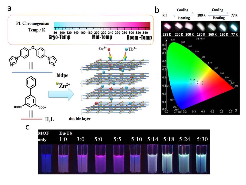 Tuning the Solid-State White Light Emission of Postsynthetic Lanthanide-Encapsulated Double-Layer MOFs for Three-Color Luminescent Thermometry Applications Liya Qiu?, Chengfeng Yu?, Xiaoling Wang?, Yangbin Xie?, Alexander M. Kirillov?§, Wei Huang*?, Jipeng Li?, Peng Gao?, Ting Wu?, Xiangwei Gu?, Qi Nie?, and Dayu Wu*? ? Jiangsu Key Laboratory of Advanced Catalytic Materials and Technology, Advanced Catalysis and Green Manufacturing Collaborative Innovation Center, School of Petrochemical Engineering, Changzhou University, Changzhou, Jiangsu213164, People’s Republic of China. ? Centro de Quimica Estrutural, Instituto Superior Tecnico, Universidade de Lisboa, Av. Rovisco Pais, 1049-001 Lisbon, Portugal. § Peoples’ Friendship University of Russia (RUDN University), 6 Miklukho-Maklayast., Moscow 117198, Russian Federation. 近日,吳大雨課題組通過后修飾方法成功合成了一例稀土嵌入二維雙層金屬有機(jī)框架(MOF)晶態(tài)材料,通過精準(zhǔn)調(diào)控稀土離子的摻雜比例,實(shí)現(xiàn)了MOF材料的全彩色指紋發(fā)光。這類二維材料展現(xiàn)出優(yōu)良的溫度傳感功能,對(duì)溫度變化反應(yīng)靈敏、可逆切換。有望應(yīng)用在寬溫區(qū)(幾K到670 K)以及極端環(huán)境下的溫度計(jì)領(lǐng)域。 原文鏈接:https://pubs.acs.org.ccindex.cn/doi/pdf/10.1021/acs.inorgchem.9b00084.